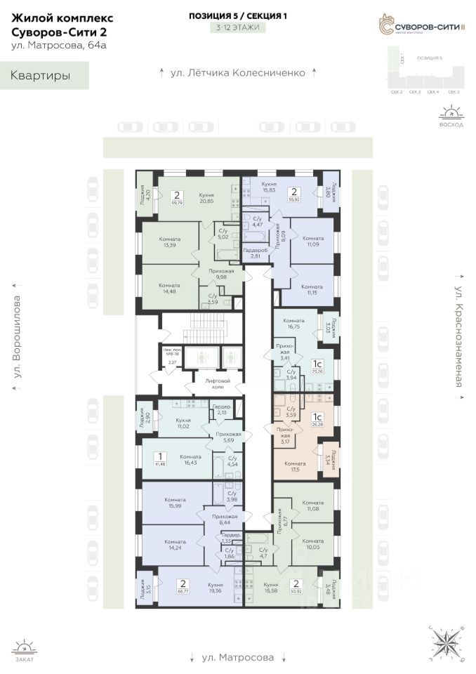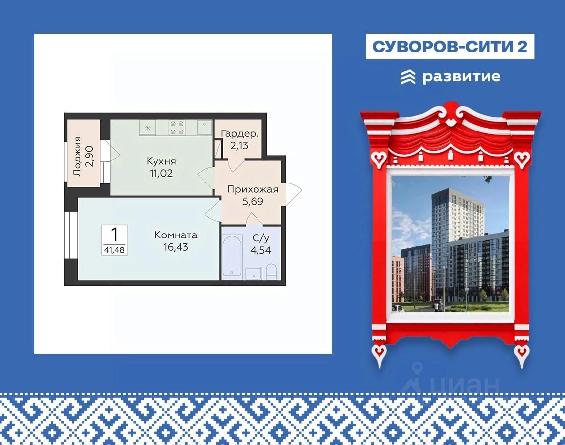 Жилой комплекс "Суворов Сити II" — продолжение современного масштабного проекта "Суворов Сити", находящегося в спальном районе в четырех километрах от центра города. Проект сочетает удачное расположение с удобными планировками, актуальным дизайном и приватным двором. Расположение Пешком: — 510 минут Автобусные остановки; — 12 минут Школа 50; — 15 минут Детский сад 174; — 20 минут ТРЦ "Армада". На автомобиле: — 1 минута улица Матросова; — 5 минут улица Ворошилова, проспект Патриотов; — 10 минут Вогрэсовский мост; — 15 минут проспект Революции, Чернавский мост, вокзал "Воронеж-1"; — 30 минут выезд на М-4; — 50 минут аэропорт "Воронеж". Лобби — Колясочная; — Лапомойка для питомцев; — Входные группы с окнами в пол; — Лифты с возможностью спуска в подземный паркинг на 465 машиномест. Благоустройство — Двор закрыт от прохожих и транспорта; — Доступ на внутреннюю территорию, в парадные и в паркинг по ключам; — Круглосуточное видеонаблюдение; — Собственная инфраструктура (важные магазины и сервисы) на первом этаже здания; — Детский сад во дворе ЖК; — Пешеходная аллея; — Места для отдыха со скамейками и перголами; — Детские игровые и спортивные площадки; — Навигационная подсветка в темное время суток. Окружение — Спокойный спальный район; — Близко магазины, кафе, медклиник, салонов красоты, аптек; — В шаговой доступности скверы, сады, ТРЦ, стадион. О застройщике Федеральный застройщик ГК "Развитие" лидирует по количеству возводимых объектов и входит в ТОП-20 девелоперов России. За 10 лет на рынке компания ввела в эксплуатацию свыше 700 тыс. кв. м жилья, еще столько же находится в стадии строительства. В портфеле — 30 завершенных проектов и более десятка тысяч заселенных квартир. Девелопер сотрудничает с ведущими отраслевыми партнерами, включая "Северсталь" и "Технониколь". "Развитие" специализируется на строительстве жилых комплексов и микрорайонов, развитии инфраструктуры и создании комфортной городской среды. Девелопер реализует проекты в Воронеже, Москве и области, Ленинградской области, Крыму, Орле и Самаре. Основные форматы — ЖК комфорт- и бизнес-класса, апарт-отели, прибрежные премиальные комплексы и жилые кластеры с коммерцией, парковками и благоустроенными дворами.