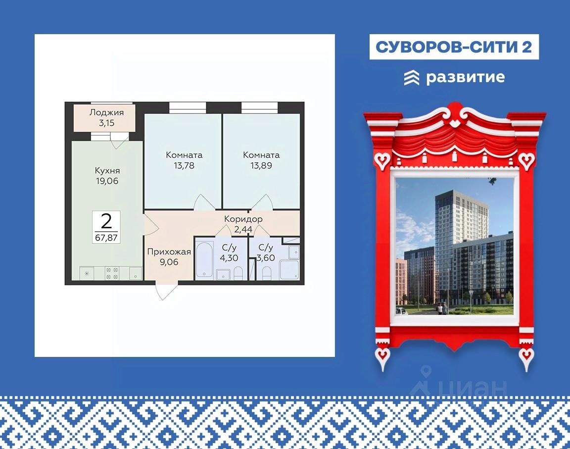 Продается 2-комнатная квартира 67,87 кв.м. на 15 этаже. Жилой комплекс "Суворов Сити II" — продолжение современного масштабного проекта "Суворов Сити", находящегося в спальном районе в четырех километрах от центра города. Проект сочетает удачное расположение с удобными планировками, актуальным дизайном и приватным двором.