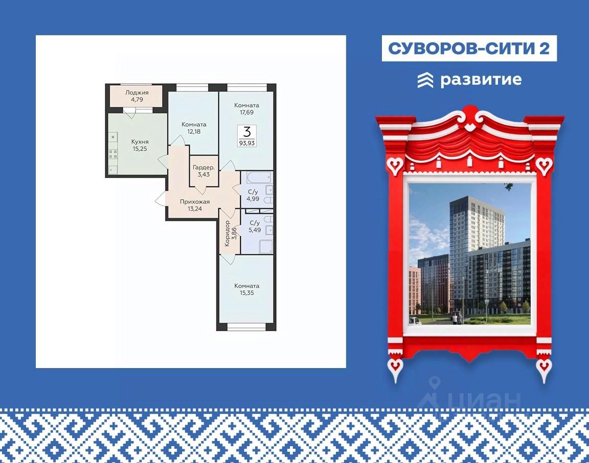 Продается 3-комнатная квартира 93,93 кв.м. на 4 этаже. Жилой комплекс "Суворов Сити II" — продолжение современного масштабного проекта "Суворов Сити", находящегося в спальном районе в четырех километрах от центра города. Проект сочетает удачное расположение с удобными планировками, актуальным дизайном и приватным двором.