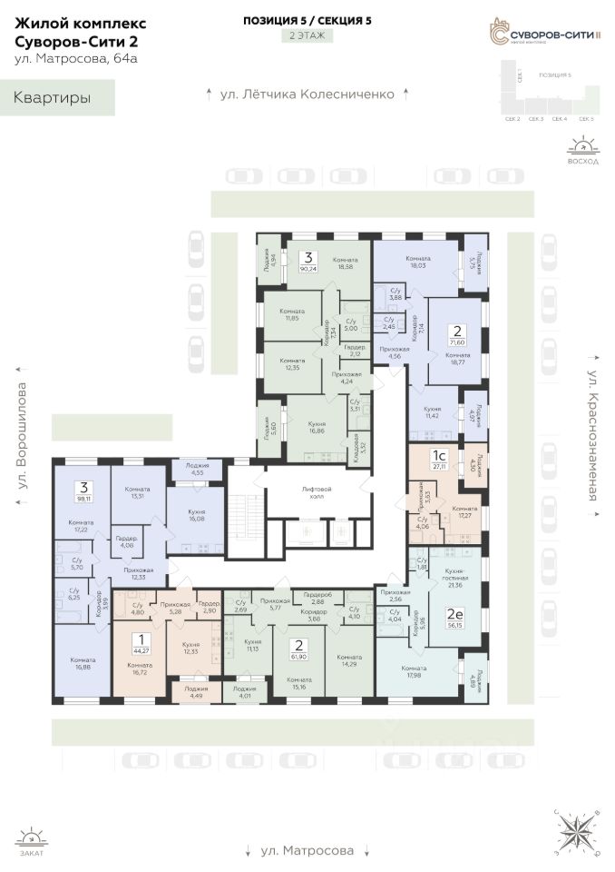 Жилой комплекс "Суворов Сити II" — продолжение современного масштабного проекта "Суворов Сити", находящегося в спальном районе в четырех километрах от центра города. Проект сочетает удачное расположение с удобными планировками, актуальным дизайном и приватным двором. Расположение Пешком: — 510 минут Автобусные остановки; — 12 минут Школа 50; — 15 минут Детский сад 174; — 20 минут ТРЦ "Армада". На автомобиле: — 1 минута улица Матросова; — 5 минут улица Ворошилова, проспект Патриотов; — 10 минут Вогрэсовский мост; — 15 минут проспект Революции, Чернавский мост, вокзал "Воронеж-1"; — 30 минут выезд на М-4; — 50 минут аэропорт "Воронеж". Лобби — Колясочная; — Лапомойка для питомцев; — Входные группы с окнами в пол; — Лифты с возможностью спуска в подземный паркинг на 465 машиномест. Благоустройство — Двор закрыт от прохожих и транспорта; — Доступ на внутреннюю территорию, в парадные и в паркинг по ключам; — Круглосуточное видеонаблюдение; — Собственная инфраструктура (важные магазины и сервисы) на первом этаже здания; — Детский сад во дворе ЖК; — Пешеходная аллея; — Места для отдыха со скамейками и перголами; — Детские игровые и спортивные площадки; — Навигационная подсветка в темное время суток. Окружение — Спокойный спальный район; — Близко магазины, кафе, медклиник, салонов красоты, аптек; — В шаговой доступности скверы, сады, ТРЦ, стадион. О застройщике Федеральный застройщик ГК "Развитие" лидирует по количеству возводимых объектов и входит в ТОП-20 девелоперов России. За 10 лет на рынке компания ввела в эксплуатацию свыше 700 тыс. кв. м жилья, еще столько же находится в стадии строительства. В портфеле — 30 завершенных проектов и более десятка тысяч заселенных квартир. Девелопер сотрудничает с ведущими отраслевыми партнерами, включая "Северсталь" и "Технониколь". "Развитие" специализируется на строительстве жилых комплексов и микрорайонов, развитии инфраструктуры и создании комфортной городской среды. Девелопер реализует проекты в Воронеже, Москве и области, Ленинградской области, Крыму, Орле и Самаре. Основные форматы — ЖК комфорт- и бизнес-класса, апарт-отели, прибрежные премиальные комплексы и жилые кластеры с коммерцией, парковками и благоустроенными дворами.