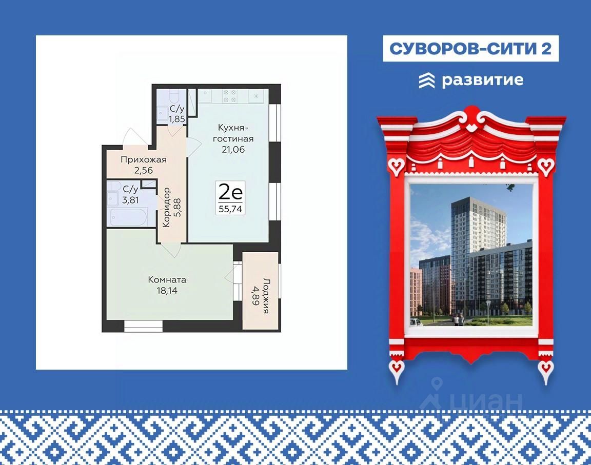 Продается 2-комнатная квартира 55,74 кв.м. на 6 этаже. Жилой комплекс "Суворов Сити II" — продолжение современного масштабного проекта "Суворов Сити", находящегося в спальном районе в четырех километрах от центра города. Проект сочетает удачное расположение с удобными планировками, актуальным дизайном и приватным двором.