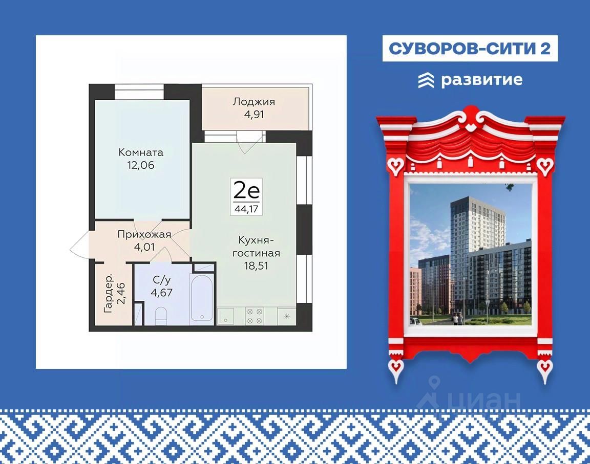 Продается 2-комнатная квартира 44,17 кв.м. на 2 этаже. Жилой комплекс "Суворов Сити II" — продолжение современного масштабного проекта "Суворов Сити", находящегося в спальном районе в четырех километрах от центра города. Проект сочетает удачное расположение с удобными планировками, актуальным дизайном и приватным двором.