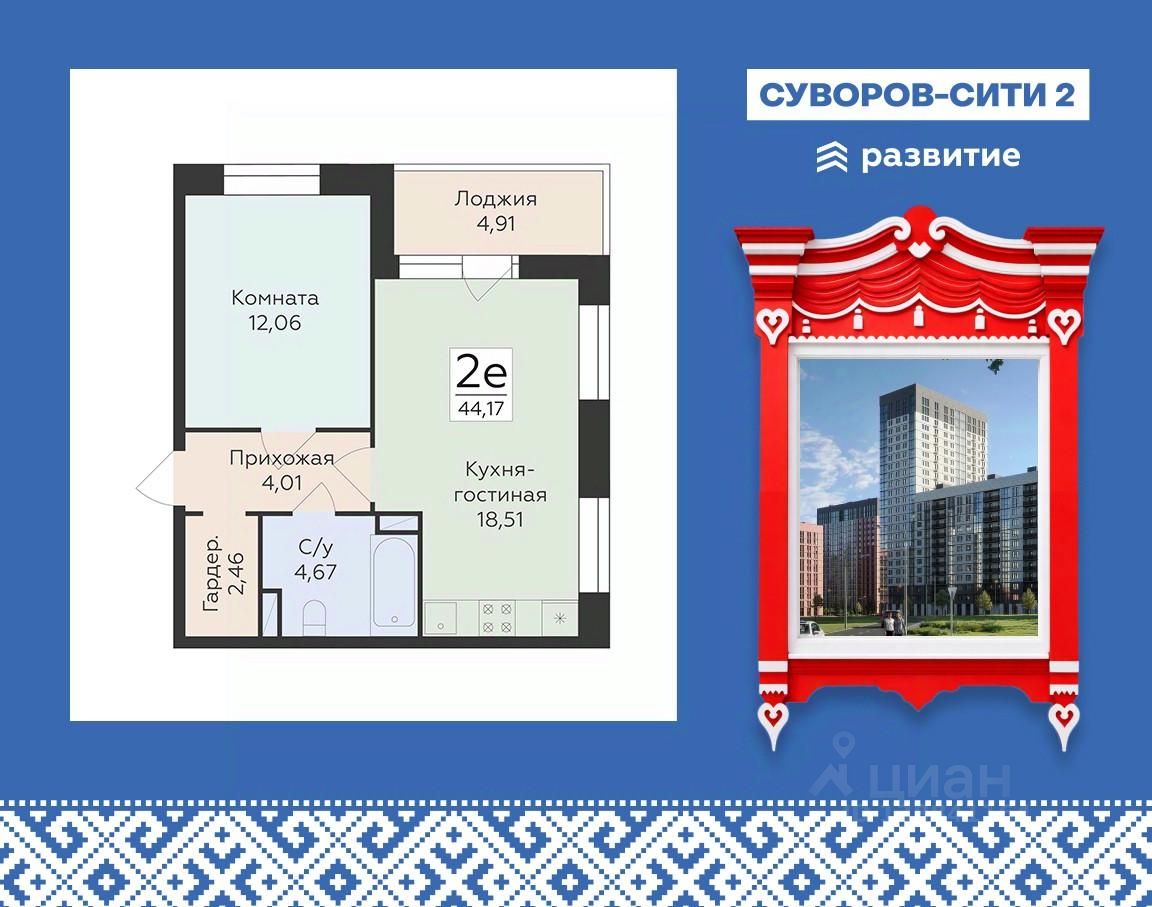 Продается 2-комнатная квартира 44,17 кв.м. на 4 этаже. Жилой комплекс "Суворов Сити II" — продолжение современного масштабного проекта "Суворов Сити", находящегося в спальном районе в четырех километрах от центра города. Проект сочетает удачное расположение с удобными планировками, актуальным дизайном и приватным двором.