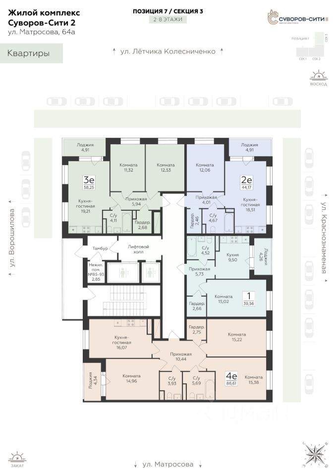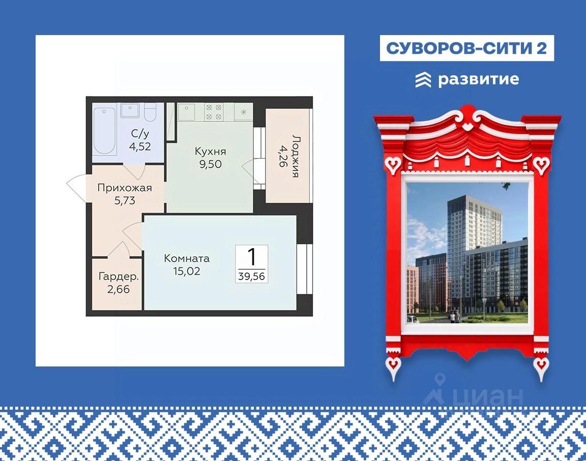 Жилой комплекс "Суворов Сити II" — продолжение современного масштабного проекта "Суворов Сити", находящегося в спальном районе в четырех километрах от центра города. Проект сочетает удачное расположение с удобными планировками, актуальным дизайном и приватным двором. Расположение Пешком: — 510 минут Автобусные остановки; — 12 минут Школа 50; — 15 минут Детский сад 174; — 20 минут ТРЦ "Армада". На автомобиле: — 1 минута улица Матросова; — 5 минут улица Ворошилова, проспект Патриотов; — 10 минут Вогрэсовский мост; — 15 минут проспект Революции, Чернавский мост, вокзал "Воронеж-1"; — 30 минут выезд на М-4; — 50 минут аэропорт "Воронеж". Лобби — Колясочная; — Лапомойка для питомцев; — Входные группы с окнами в пол; — Лифты с возможностью спуска в подземный паркинг на 465 машиномест. Благоустройство — Двор закрыт от прохожих и транспорта; — Доступ на внутреннюю территорию, в парадные и в паркинг по ключам; — Круглосуточное видеонаблюдение; — Собственная инфраструктура (важные магазины и сервисы) на первом этаже здания; — Детский сад во дворе ЖК; — Пешеходная аллея; — Места для отдыха со скамейками и перголами; — Детские игровые и спортивные площадки; — Навигационная подсветка в темное время суток. Окружение — Спокойный спальный район; — Близко магазины, кафе, медклиник, салонов красоты, аптек; — В шаговой доступности скверы, сады, ТРЦ, стадион. О застройщике Федеральный застройщик ГК "Развитие" лидирует по количеству возводимых объектов и входит в ТОП-20 девелоперов России. За 10 лет на рынке компания ввела в эксплуатацию свыше 700 тыс. кв. м жилья, еще столько же находится в стадии строительства. В портфеле — 30 завершенных проектов и более десятка тысяч заселенных квартир. Девелопер сотрудничает с ведущими отраслевыми партнерами, включая "Северсталь" и "Технониколь". "Развитие" специализируется на строительстве жилых комплексов и микрорайонов, развитии инфраструктуры и создании комфортной городской среды. Девелопер реализует проекты в Воронеже, Москве и области, Ленинградской области, Крыму, Орле и Самаре. Основные форматы — ЖК комфорт- и бизнес-класса, апарт-отели, прибрежные премиальные комплексы и жилые кластеры с коммерцией, парковками и благоустроенными дворами.