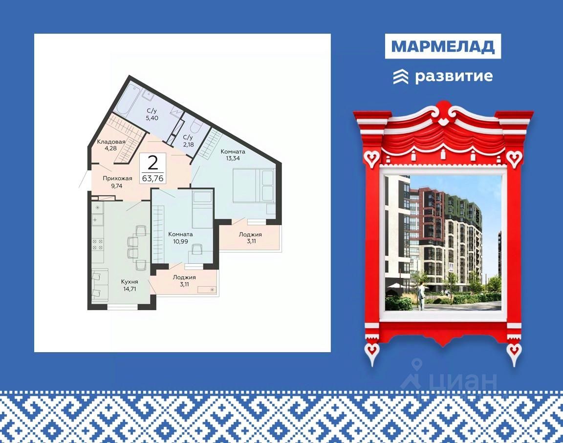 Продается 2-комнатная квартира 63,76 кв.м. на 9 этаже.