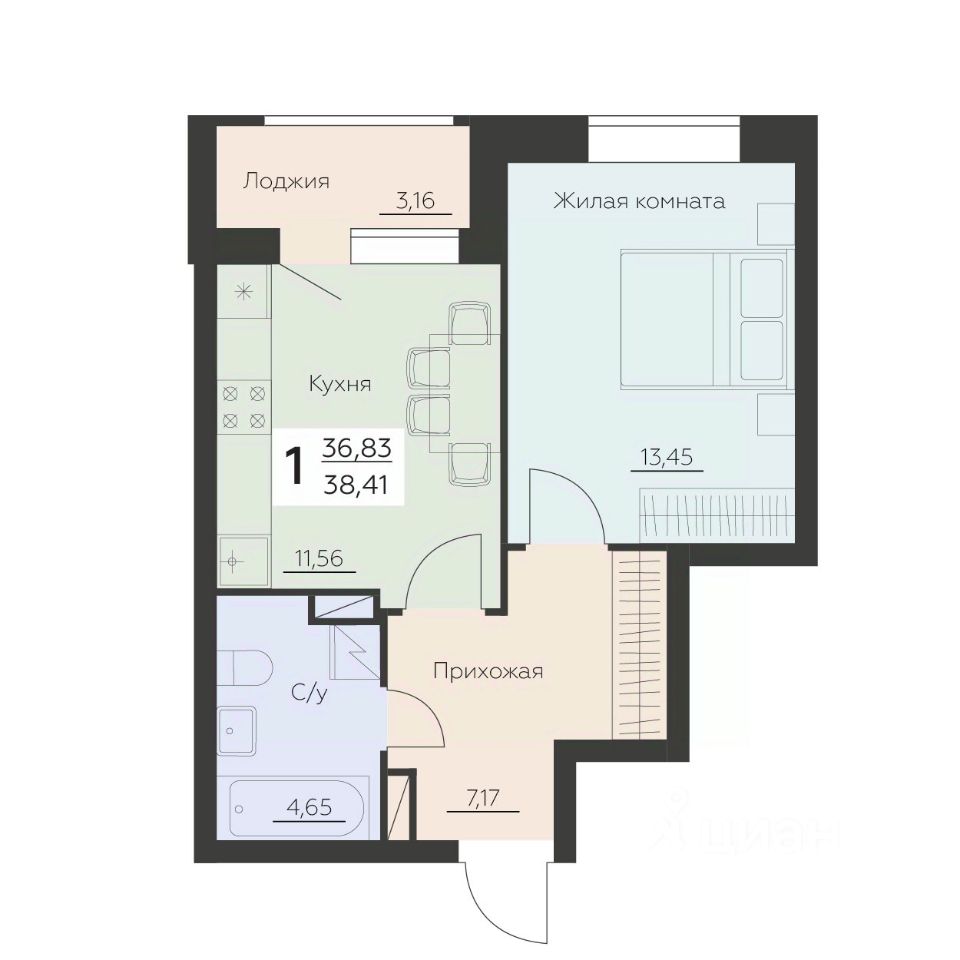 Общая площадь38,41 м²