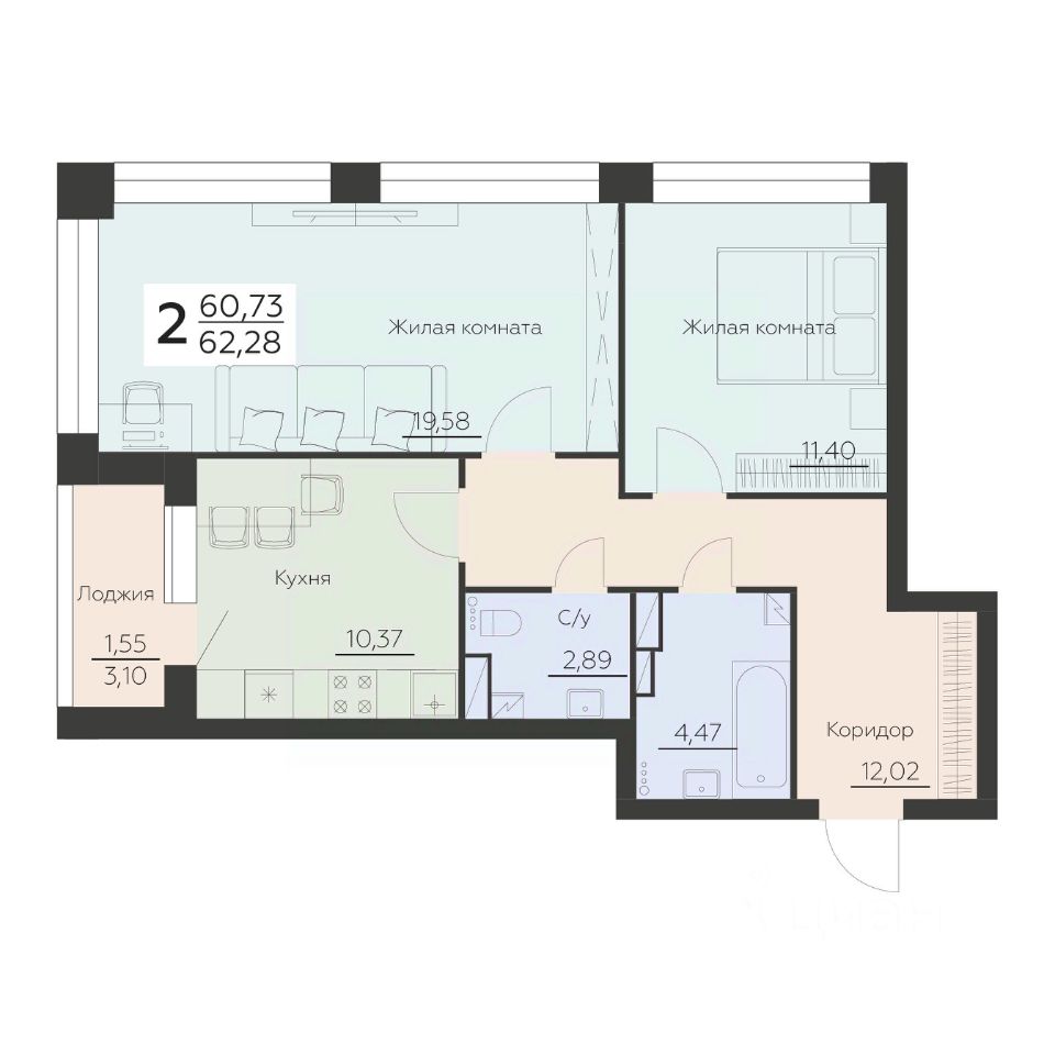 Общая площадь62,28 м²