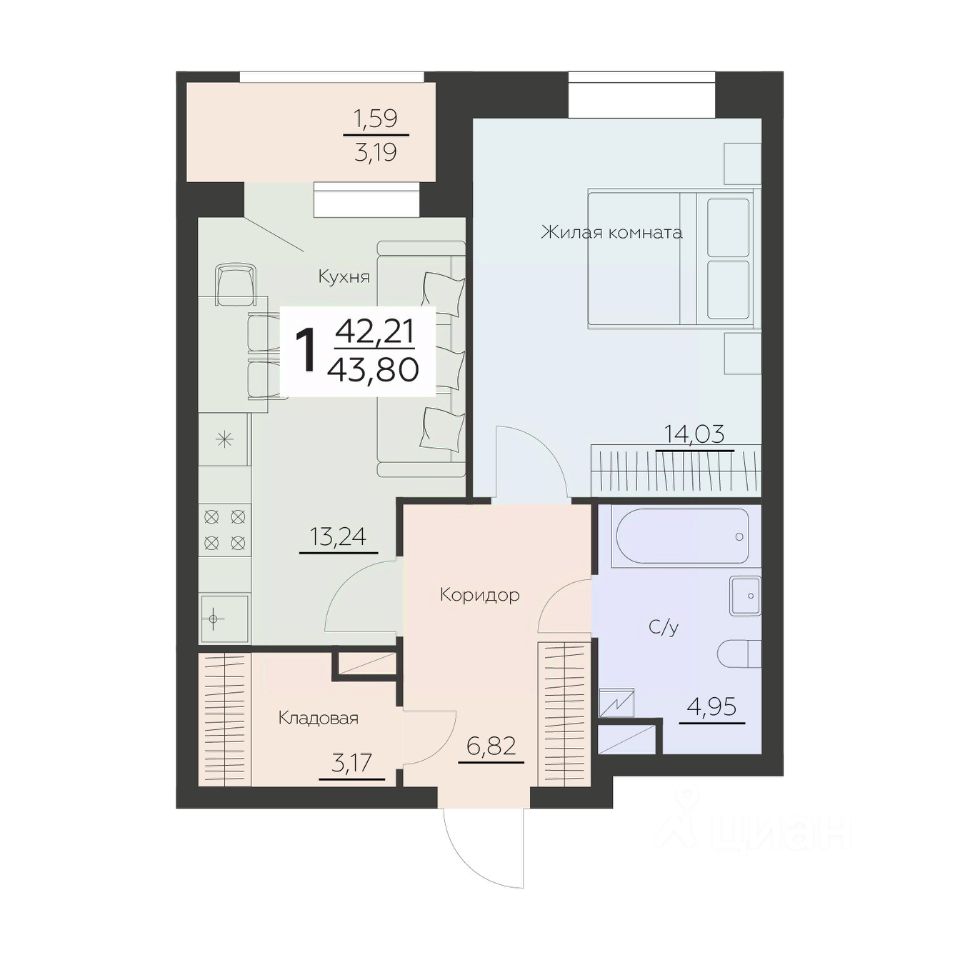 Общая площадь43,8 м²