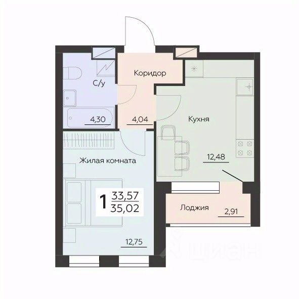 Продается 1-комн. квартира, 35,02 м²