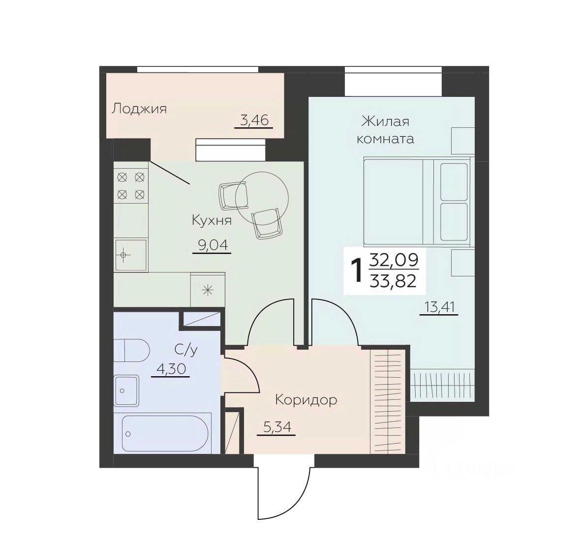 Общая площадь33,82 м²