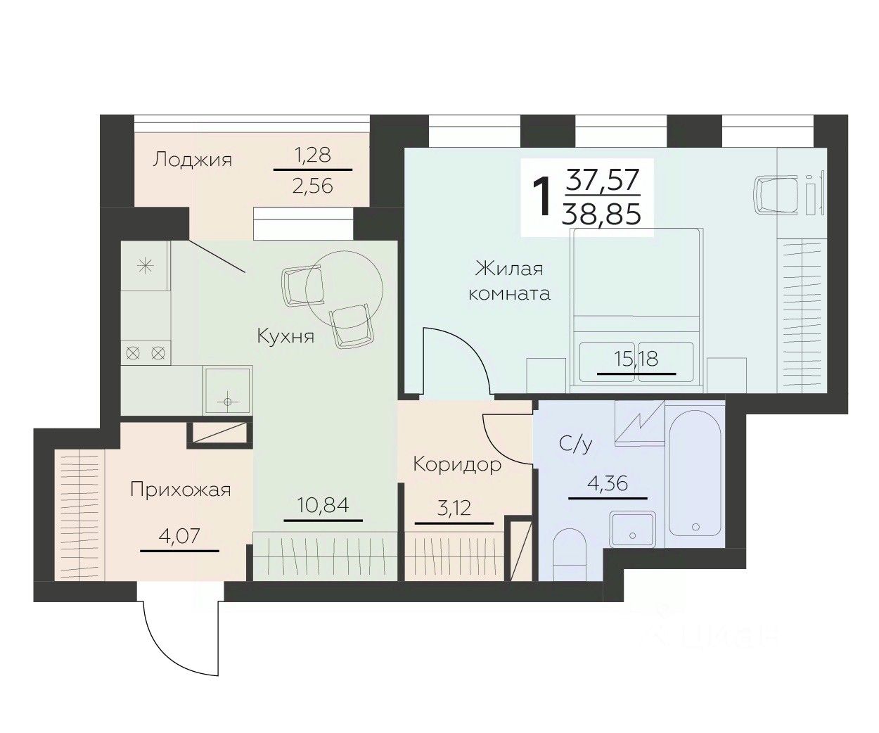 Общая площадь38,85 м²