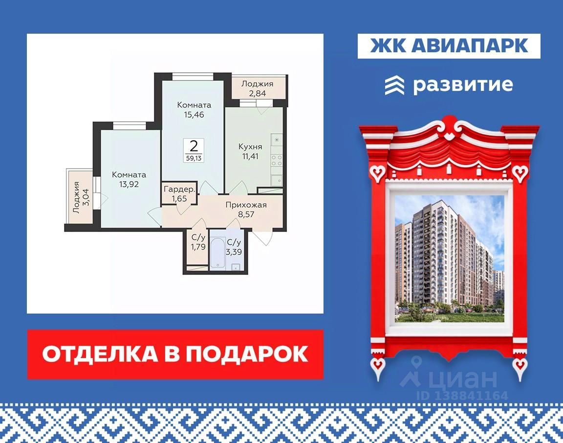 Продается 2-комнатная квартира 59,13 кв.м. на 9 этаже. Жилой Комплекс "АВИАПАРК" расположен в микрорайоне Шилово города Воронежа, который является самой экологичной локацией города. ЖК строится по монолитно-кирпичной технологии. Места общего пользования, холлы и коридоры выполнены по дизайнерскому проекту. В квартирах выполняется качественная отделка, лучевая разводка системы отопления. Неоспоримое преимущество проекта — возможность приобрести и чистовую отделку. Первый этаж займет магазин Пятерочка. Благоустройство прилегающей территории включает в себя: организацию зон отдыха, детских игровых и спортивных площадок, просторный паркинг на территории ЖК, а также комплексное озеленение. В непосредственной близости расположены образовательные учреждение и магазины.
