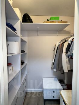Гардеробная комната с шкафами и полками с одной стороны и штангой для вешалок с другой стороны.