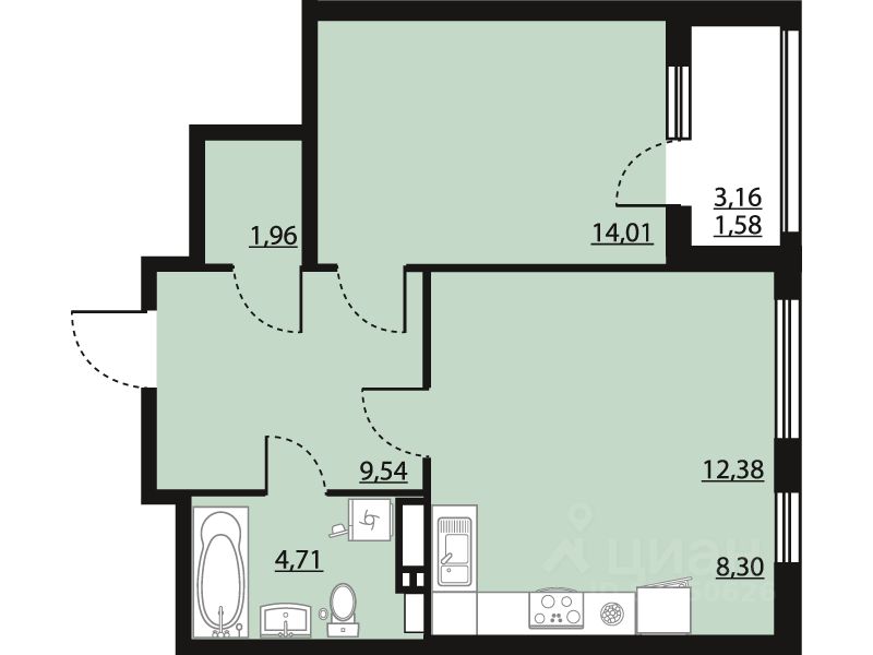 Продается 1-комн. квартира, 52,48 м²