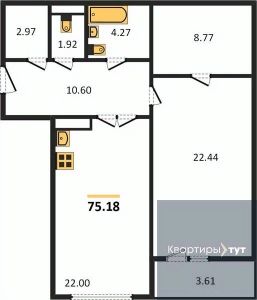 Квартира: 1 к 74,25 кв.м., 3 этаж в комплексе Бунин, 2 очередь, корп.1 (Секции 8-10), сдача: 4кв. , этажей: 20, адрес Воронеж г., Московский пр., д. 132, Застройщик: ВДК.