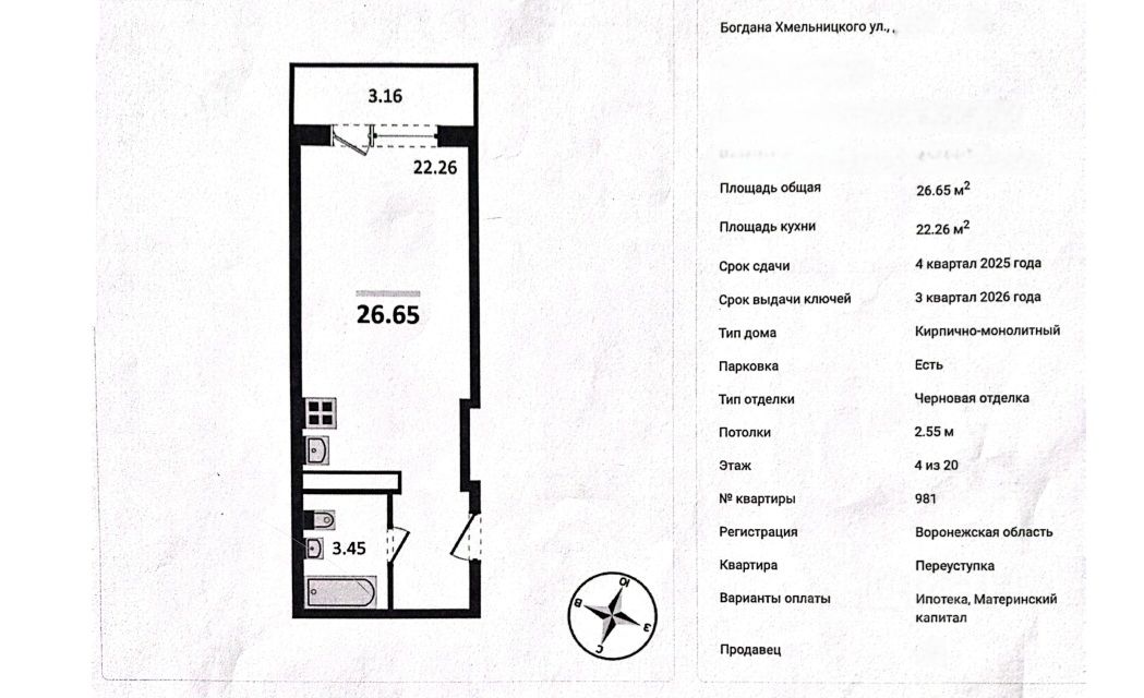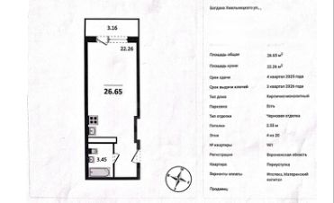 Общая площадь: 26,65 м² — идеально для одного человека или молодой пары.
