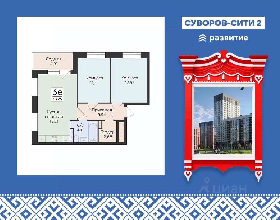 Продается 3-комнатная квартира 58,25 кв.м. на 6 этаже. Жилой комплекс "Суворов Сити II" — продолжение современного масштабного проекта "Суворов Сити", находящегося в спальном районе в четырех километрах от центра города. Проект сочетает удачное расположение с удобными планировками, актуальным дизайном и приватным двором.