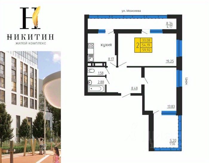 Продаётся 2-комнатная квартира в строящемся доме (Дом 2), срок сдачи: IV-кв. 2027, общей площадью 59.92 кв.м., на 4 этаже. Жилой комплекс "Никитин" расположен в Ленинском районе города Воронеж. Он представляет собой современный жилой комплекс, который включает в себя несколько многоэтажных домов, обустроенных территорию и парковочные места.