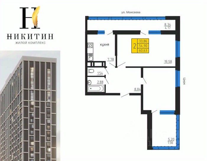 Продаётся 2-комнатная квартира в строящемся доме (Дом 2), срок сдачи: IV-кв. 2027, общей площадью 60.63 кв.м., на 19 этаже. Жилой комплекс "Никитин" расположен в Ленинском районе города Воронеж. Он представляет собой современный жилой комплекс, который включает в себя несколько многоэтажных домов, обустроенных территорию и парковочные места.