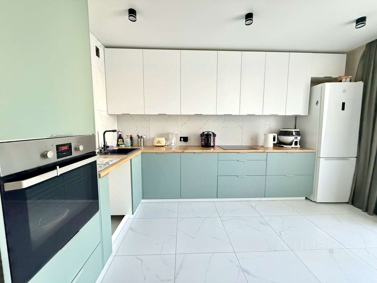 Большая кухня: 14,3 кв.м. — позволяет разместить обеденную группу и просторную гарнитур.