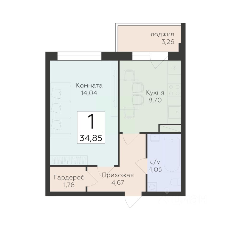Общая площадь34,85 м²