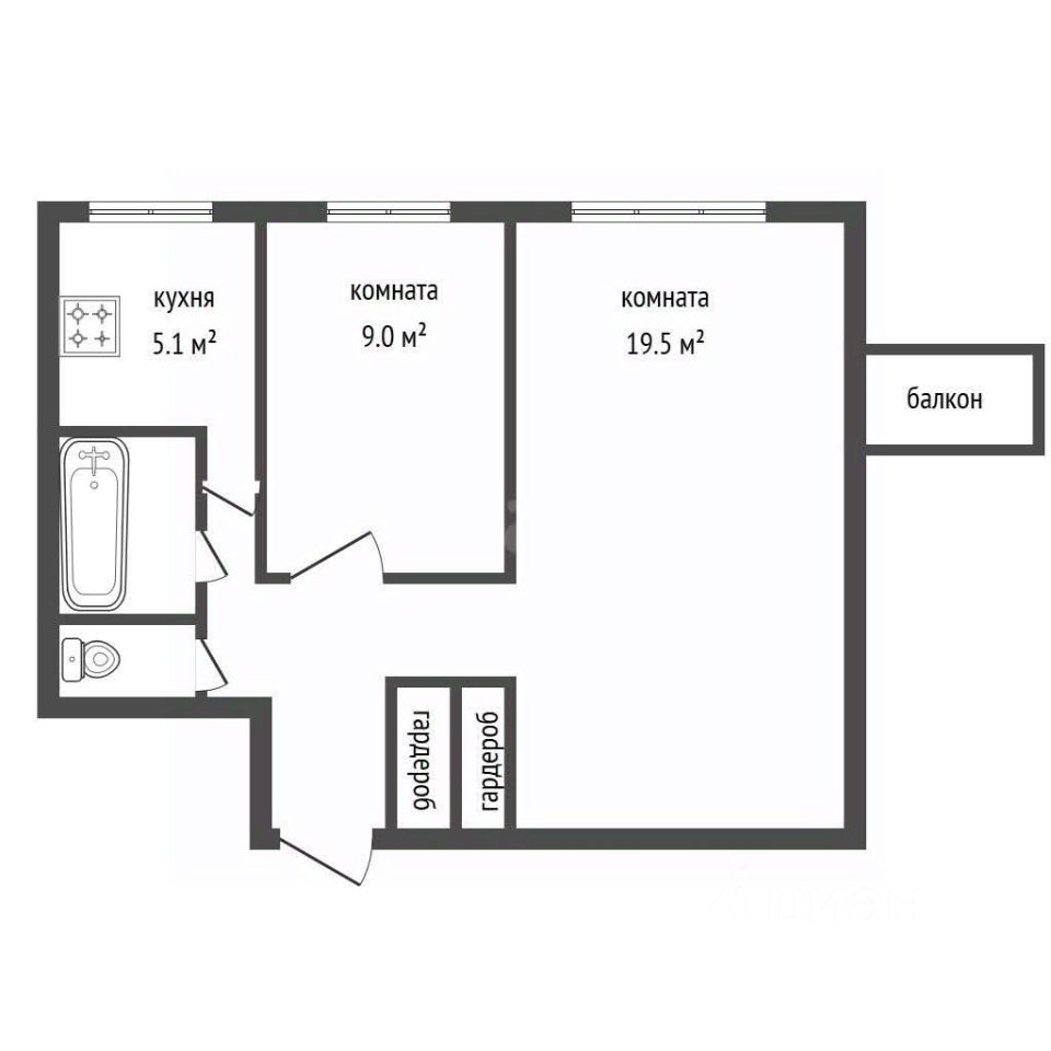 - комнаты —9 и 19,5 кв. м (раздельные);