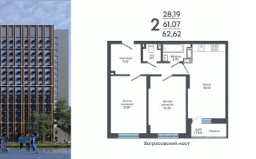 Продаётся 2-комнатная квартира в строящемся доме (Дом 2), срок сдачи: II-кв. 2029, общей площадью 62.62 кв.м., на 13 этаже. Жилой комплекс "Алые паруса" представляет собой 19-этажный жилой дом на улице Мопра, 16 вблизи парка "Алые паруса".