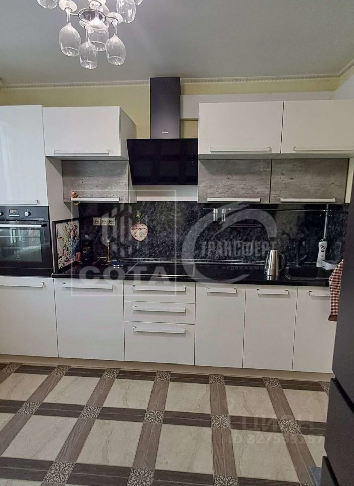 На кухне установлен современный кухонный гарнитур с встроенным духовым шкафом и индукционной варочной панелью. Кухонный стол со стульями и двух камерный холодильник, текстиль во всех комнатах, люстры - всё остаётся в квартире как на фото.