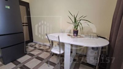 В квартире сделан евроремонт: в комнате и холле ламинат, в кухне, ванной и на балконе на полу плитка, ровные белоснежные потолки.