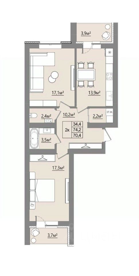 Продаётся 2-комнатная квартира в строящемся доме (Дом 1), срок сдачи: I-кв. 2027, общей площадью 70.4 кв.м., на 1 этаже. Новый жилой комплекс "Микрорайон Благодатный" от Специализированного застройщика "ВИТ-СТРОЙ" расположен по адресу: Воронежская обл., с. Ямное, по ул. Графа Орлова.