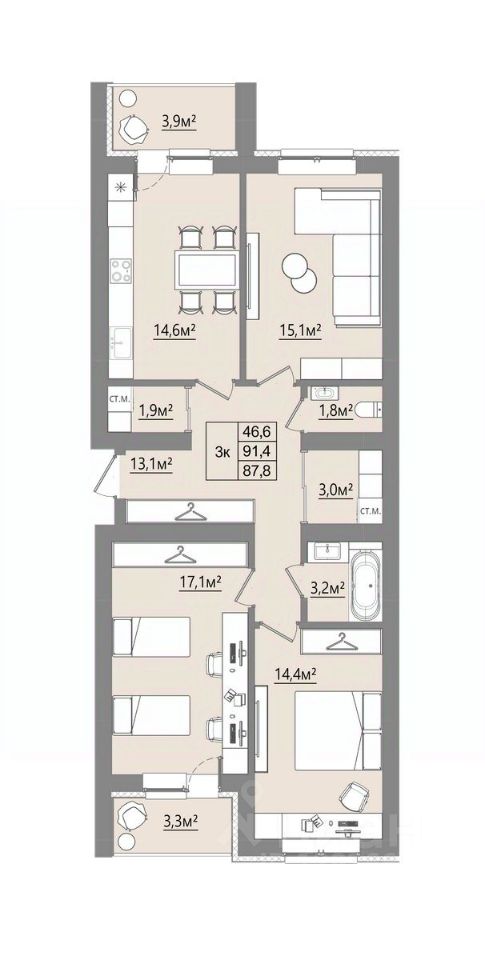 Продаётся 3-комнатная квартира в строящемся доме (Дом 1), срок сдачи: I-кв. 2027, общей площадью 87.8 кв.м., на 3 этаже. Новый жилой комплекс "Микрорайон Благодатный" от Специализированного застройщика "ВИТ-СТРОЙ" расположен по адресу: Воронежская обл., с. Ямное, по ул. Графа Орлова.