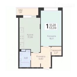 ПРОСТОРНАЯ 1-КОМНАТНАЯ 53,09 М² С ГАРДЕРОБНОЙ И КУХНЕЙ-ГОСТИНОЙ!