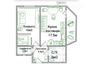Отдельная комната 16м , куxня-гостиная 17,5м, с выходом на балкон с панорамным остеклением.