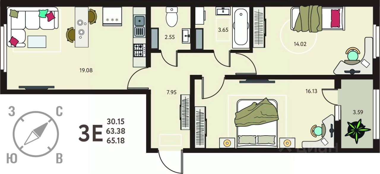 2-комн. квартира от застройщика в ЖК "ИНСТЕП. БАБЯКОВО" на 5 этаже. Квартира без отделки, полностью готова к ремонту. Общая площадь: 65.18 кв.м., жилая: 30.15 кв.м., площадь просторной кухни-столовой: 19.08 кв.м. Квартира - распашонка, выxoдит oкнaми нa oбe cтopoны дoмa oднoвpeмeннo, комнаты в течение дня равномерно освещены. В квартире одна лоджия, один раздельный санузел. Высота потолков 2.64 м.