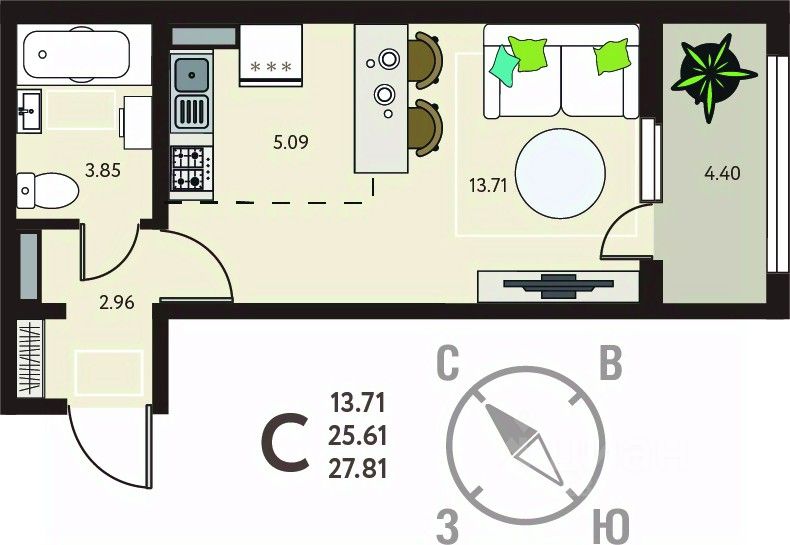 Просторная однокомнатная квартира-студия в ЖК "ИНСТЕП. БАБЯКОВО" на 12 этаже. Квартира без отделки, новый собственник может сделать ремонт по своему дизайн-проекту. Общая площадь: 27.81 кв.м., площадь гостиной 18.8 кв.м., из которых 5.09 кв.м. выделено под кухонную зону. Все окна выходят на одну сторону. В квартире один балкон, один совмещенный санузел. Высота потолков 2.64 м.