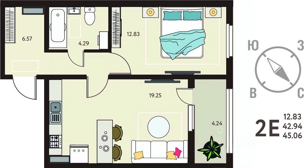 1-комн. квартира в ЖК "ИНСТЕП. БАБЯКОВО" на 12 этаже. Квартира без отделки, полностью готова к чистовой отделке и дальнейшему ремонту. Общая площадь: 45.06 кв.м., жилая: 12.83 кв.м., площадь просторной кухни-столовой: 19.25 кв.м. Все окна выходят на одну сторону. В квартире одна лоджия, один совмещенный санузел. Высота потолков 2.64 м.
