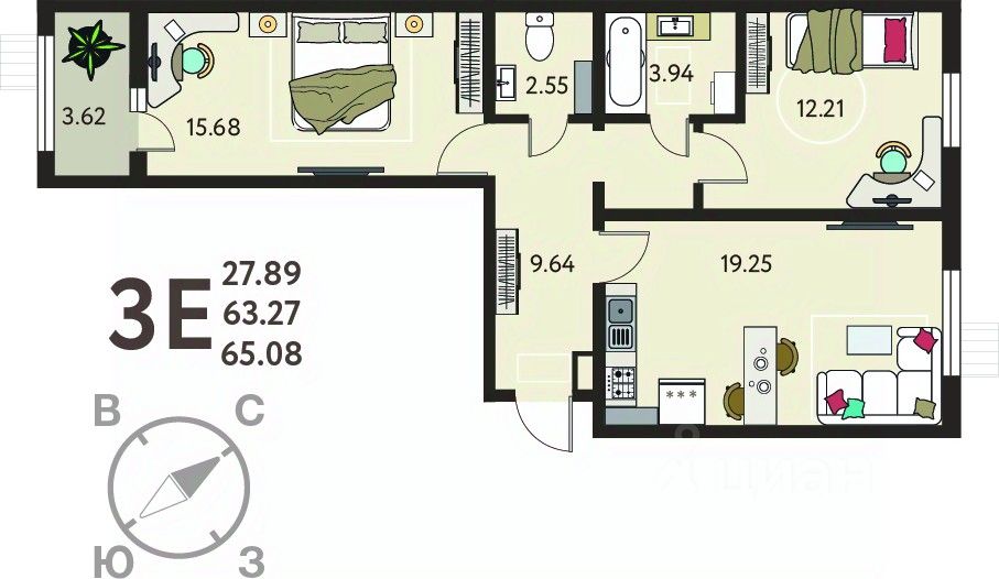 Продается двухкомнатная квартира от застройщика с отделкой в ЖК "ИНСТЕП. БАБЯКОВО" на 3 этаже. Общая площадь: 65.08 кв.м., жилая: 27.89 кв.м., площадь просторной кухни-столовой: 19.25 кв.м. Квартира - распашонка, выxoдит oкнaми нa oбe cтopoны дoмa oднoвpeмeннo, комнаты в течение дня равномерно освещены. В квартире одна лоджия, один раздельный санузел. Высота потолков 2.64 м.