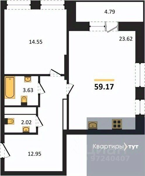 Квартира: 1 к 59,17 кв.м., 13 этаж в комплексе Галилей, 1 очередь, корп.1, сдача: 3кв. , этажей: 25, адрес Воронеж г., Кривошеина ул., д. 13/14, Застройщик: ГК Крайс.