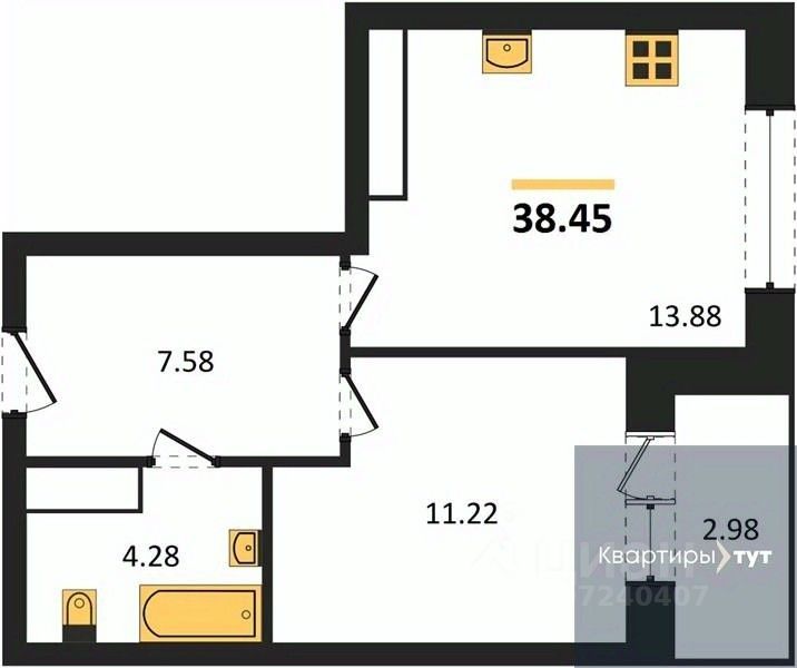 Квартира: 1 к 38,45 кв.м., 13 этаж в комплексе Галилей, 1 очередь, корп.1, сдача: 3кв. , этажей: 25, адрес Воронеж г., Кривошеина ул., д. 13/14, Застройщик: ГК Крайс.