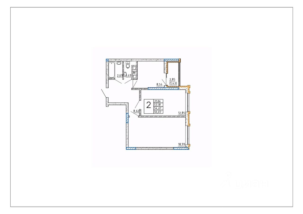 Продаётся 2-комнатная квартира в строящемся доме (Дом 1), срок сдачи: IV-кв. 2027, общей площадью 54.61 кв.м., на 9 этаже.