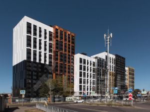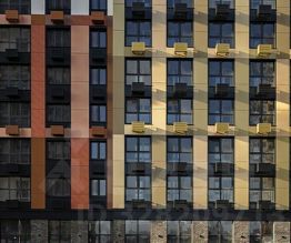 Проект представляет собой 4-секционный дом переменной этажности от 12 до 18 этажей. В облицовке фасада используются тщательно подобранные композитные алюминиевые панели 18 оттенков, формирующие динамичный неповторимый визуальный облик здания. Для сохранения рисунка фасада будут установлены корзины для кондиционеров для каждой комнаты. С верхних этажей в квартирах, которые выходят на Краснознаменную, открывается вид на водохранилище.