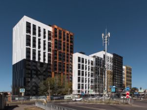 Проект представляет собой 4-секционный дом переменной этажности от 12 до 18 этажей. В облицовке фасада используются тщательно подобранные композитные алюминиевые панели 18 оттенков, формирующие динамичный неповторимый визуальный облик здания. Для сохранения рисунка фасада будут установлены корзины для кондиционеров для каждой комнаты. С верхних этажей в квартирах, которые выходят на Краснознаменную, открывается вид на водохранилище.