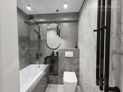 Стены покрашены, с современными вставками, много дополнительного света, красивые дизайнерские люстры, точечные светильники, подсветка. На полу ламинат, входная группа кафель. В ванной современная плитка, сантехника. Натяжной потолок, скрытые багеты. Новая металлическая дверь Door Han.
