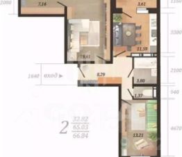 Общая площадь квартиры — 64,8 кв. м, жилая площадь — 40 кв. м, площадь кухни — 11,6 кв. м.