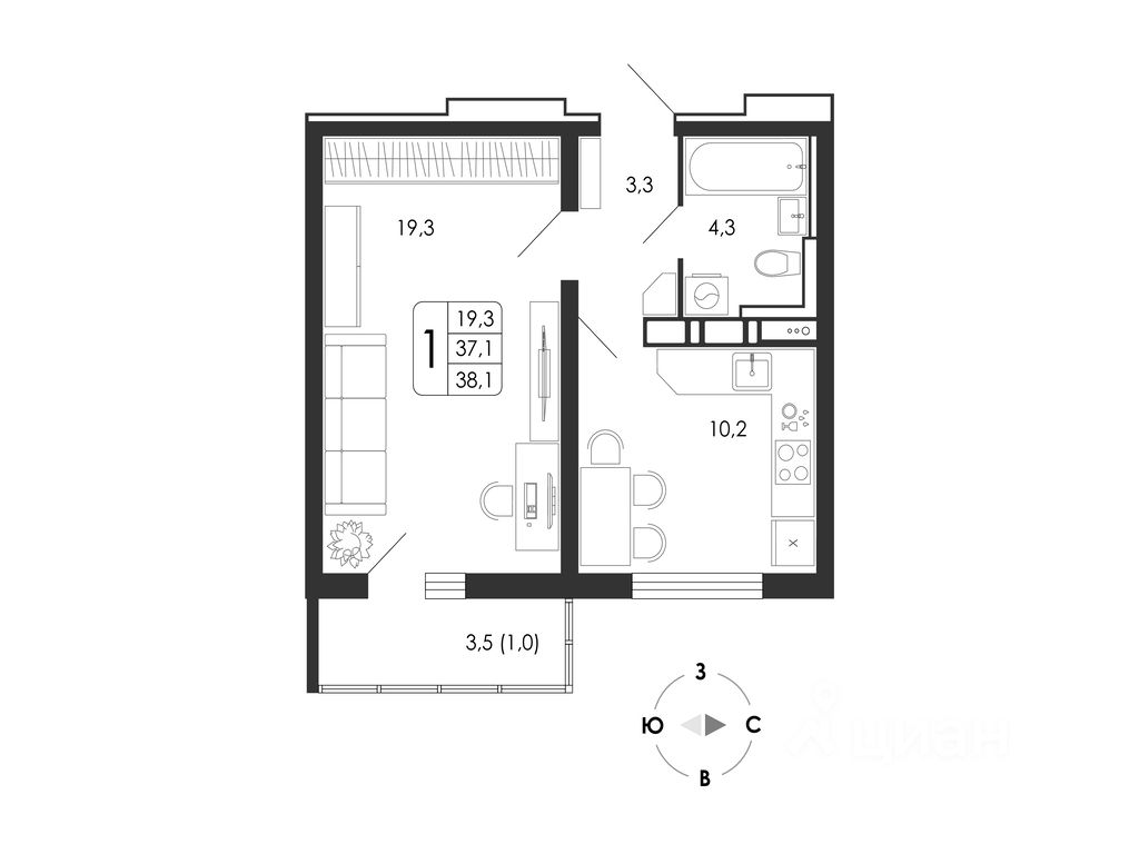 Общая площадь38,1 м²