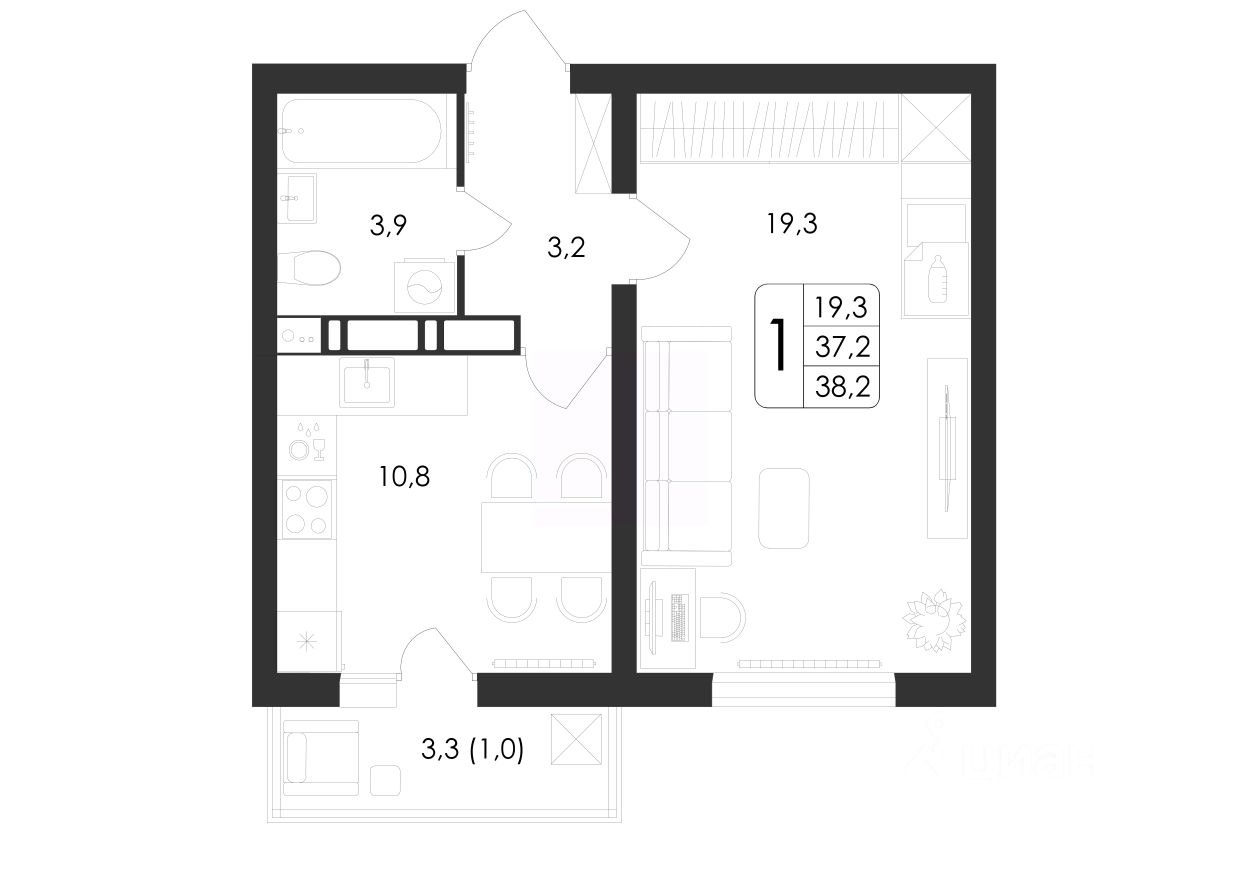 Общая площадь38,2 м²