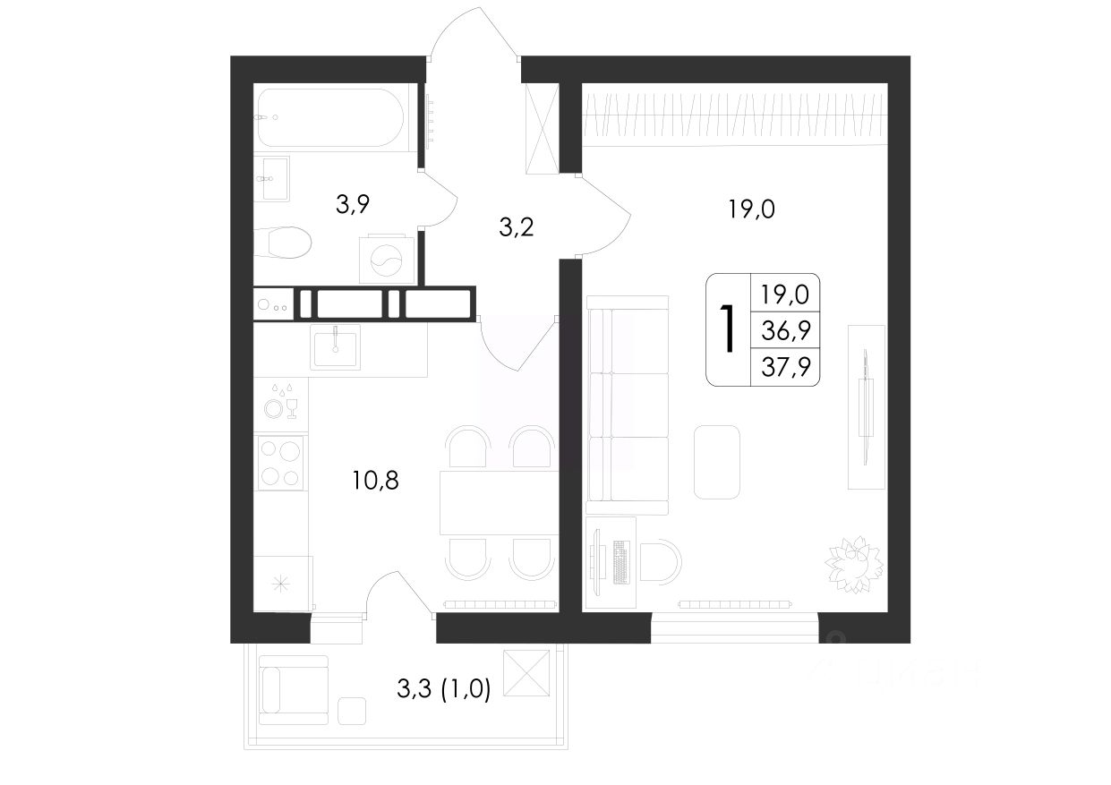Общая площадь37,9 м²