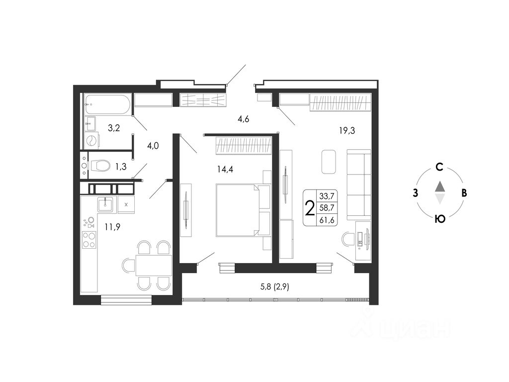 Общая площадь61,6 м²