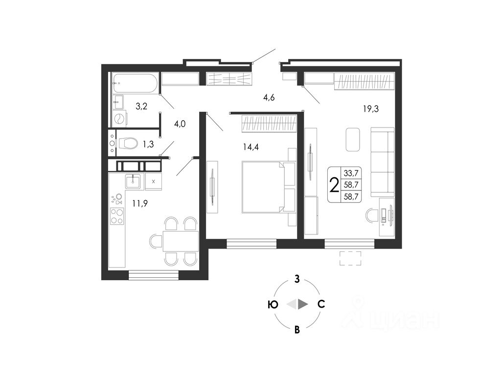 Общая площадь58,7 м²