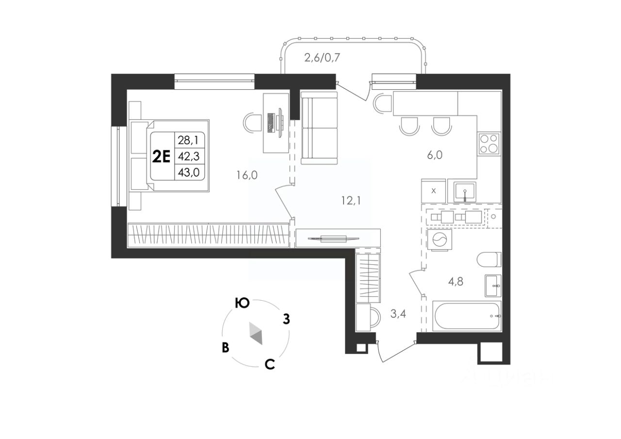 Общая площадь43 м²